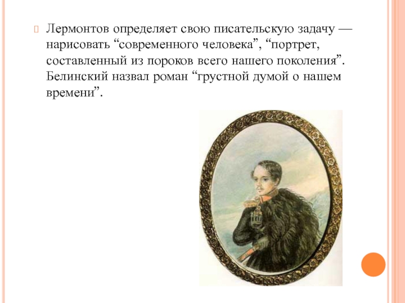 Слайд 2Лермонтов определяет свою писательскую задачу — нарисовать “современного человека”, “портрет, составленный