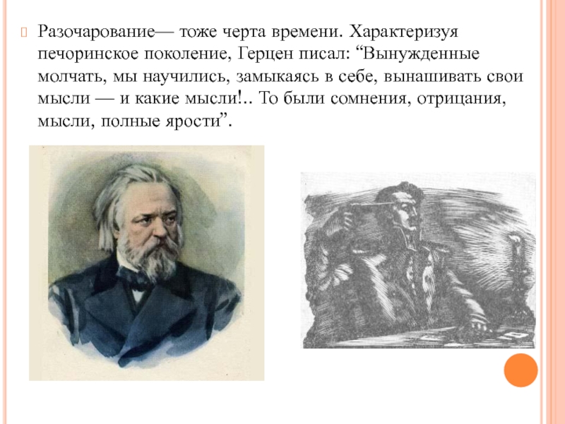 Слайд 6Разочарование— тоже черта времени. Характеризуя печоринское поколение, Герцен писал: “Вынужденные молчать,