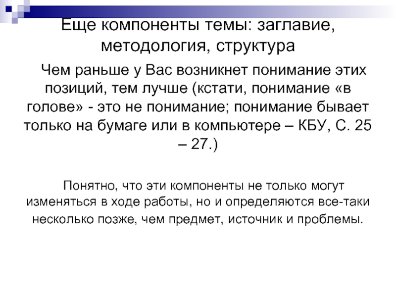 Слайд 29Еще компоненты темы: заглавие, методология, структура