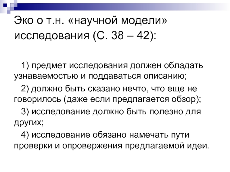 Слайд 37Эко о т.н. «научной модели» исследования (С. 38 – 42):
