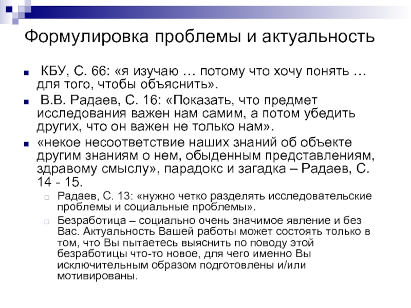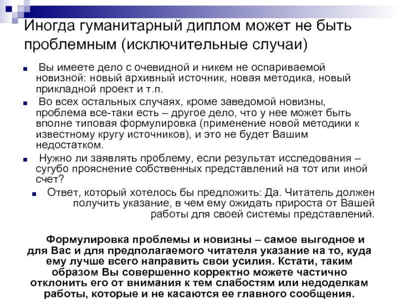 Формулировка проблемы и новизны – самое выгодное и для Вас и для предполагаемого читателя указание на то, куда ему лучше всего направить свои усилия. Кстати, таким образом Вы совершенно корректно можете частично отклонить его от внимания к тем слабостям или недоделкам работы, которые и не касаются ее главного сообщения.