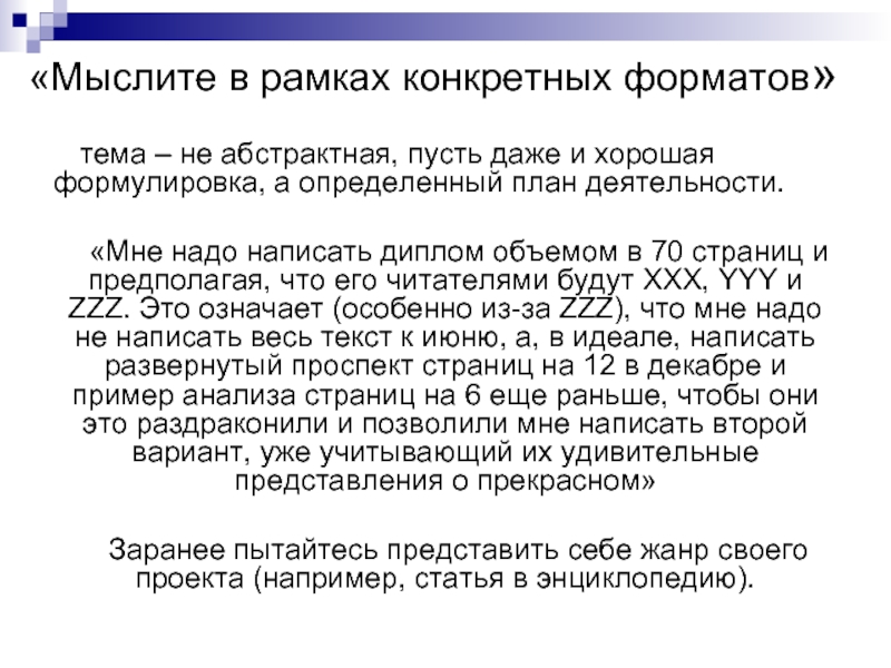 как можно раньше. Однако при этом хорошая тема все-таки значительно лучше, чем хорошая формулировка, и необязательно стараться впихнуть в официальную формулировку темы абсолютно все. Когда у Вас уже будет написана вся работа, еще будет возможность внести необходимые изменения – например, добавить подзаголовок или даже (в большинстве ВУЗов) изменить формулировку темы. Как правило, однако в этом даже не возникает потребности. Чаще бывает достаточно добавить к Введению, лучше всего в самом начале, один абзац, который объяснит, что заглавие работы означает не совсем то, что о нем можно было бы подумать.