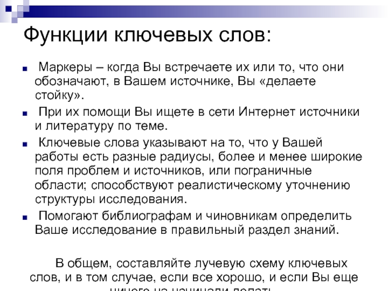 Ключевые слова указывают на то, что у Вашей работы есть разные радиусы, более и менее широкие поля проблем и источников, или пограничные области; способствуют реалистическому уточнению структуры исследования.
