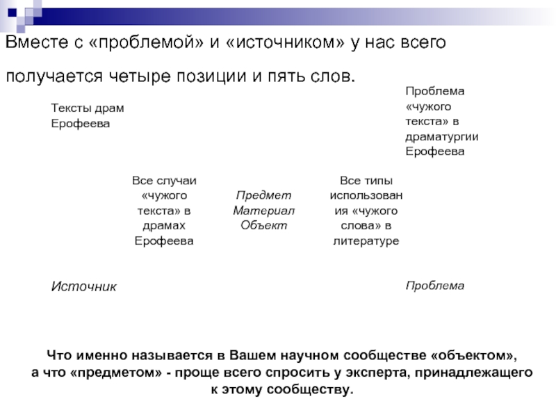 Понятно, что эти компоненты не только могут изменяться в ходе работы, но и определяются все-таки несколько позже, чем предмет, источник и проблемы.