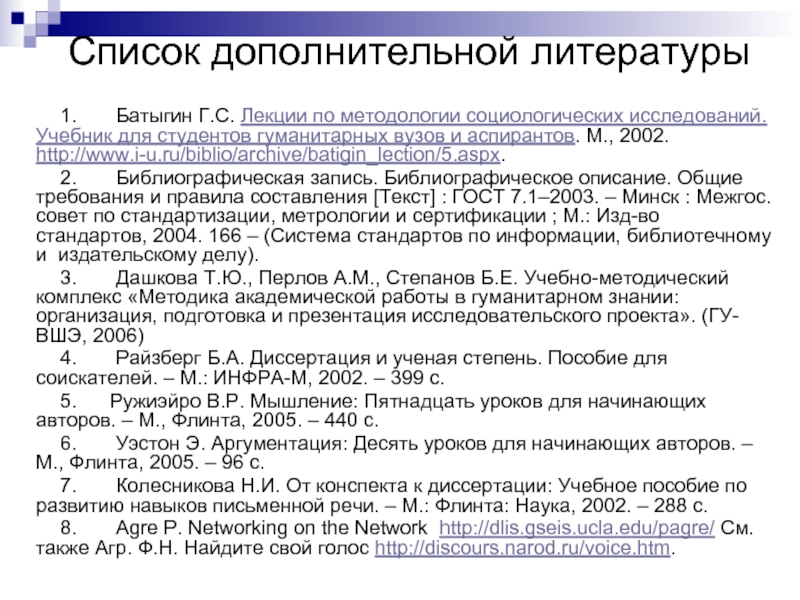 1.	Батыгин Г.С. Лекции по методологии социологических исследований. Учебник для