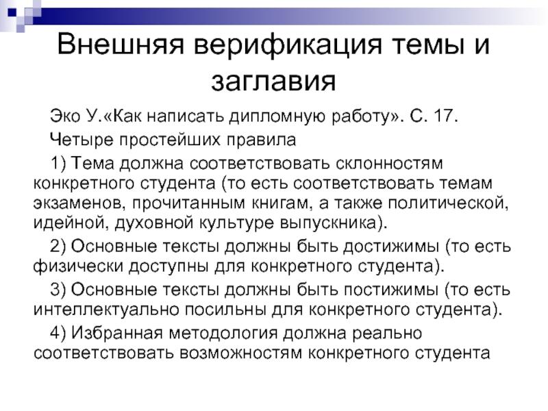 Эко У. Как написать дипломную работу. – М.: Книжный дом «Университет», 2001. – 238 с. (или другие издания).