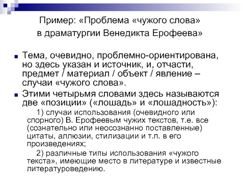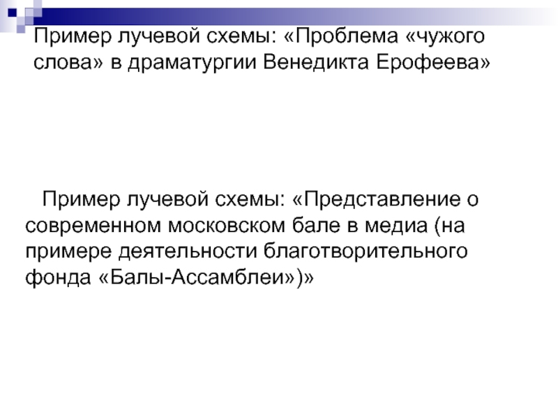 Слайд 34Пример лучевой схемы: «Проблема «чужого слова» в драматургии Венедикта Ерофеева»