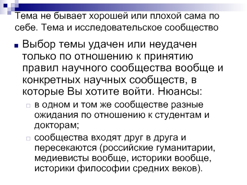 Определение темы самостоятельного исследования очень тесно связано с тем, какую литературу исследователь читает и должен считать себя обязанным отслеживать, и с тем, какой круг (научных) знакомств и насколько тесных он поддерживает.