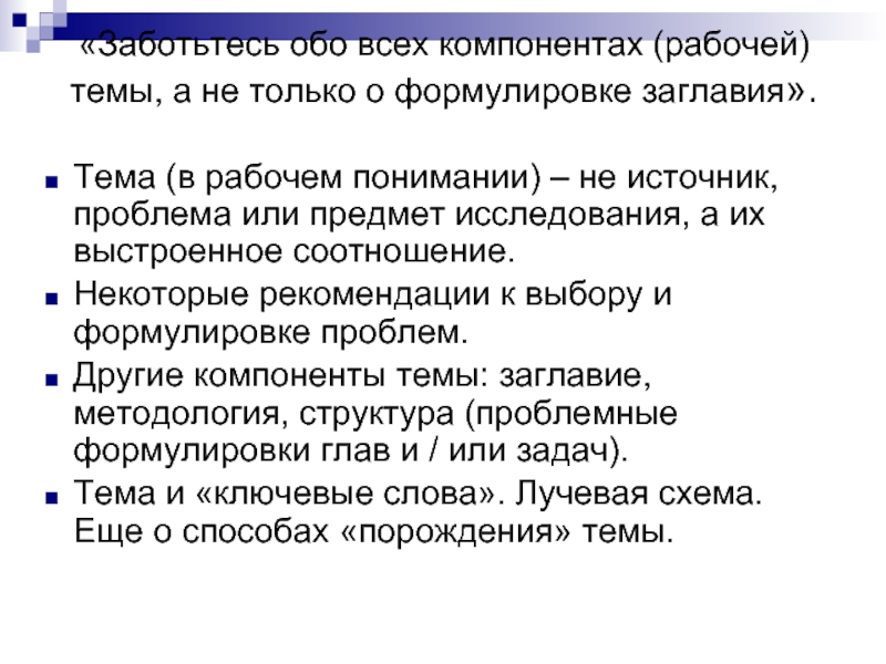 Другие компоненты темы: заглавие, методология, структура (проблемные формулировки глав и / или задач).