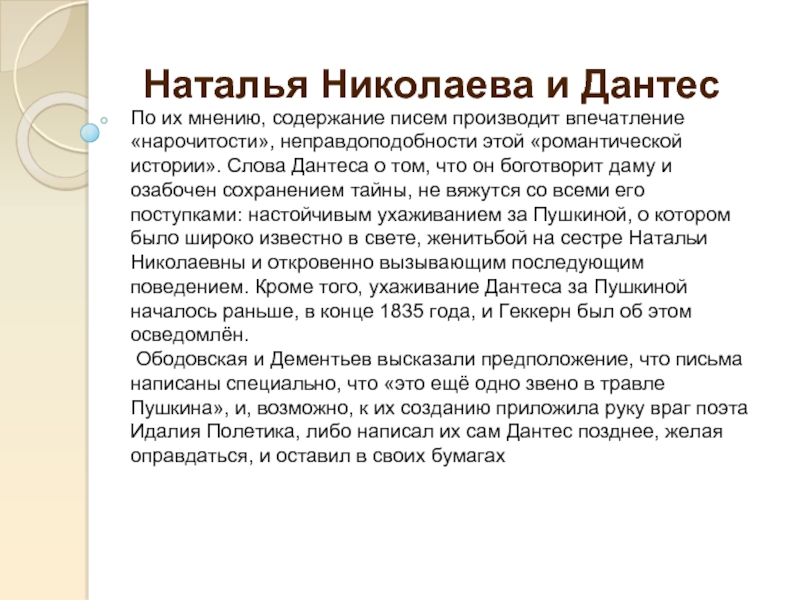 В то же время, по мнению Раевского, дальнейший ход событий показывает, «что своей цели в отношении Пушкиной Дантес не добился». Биографы Натальи Николаевны Ободовская и Дементьев указывают, что письма Дантеса не изучены с археографической стороны, без этого нельзя подтвердить время их написания.