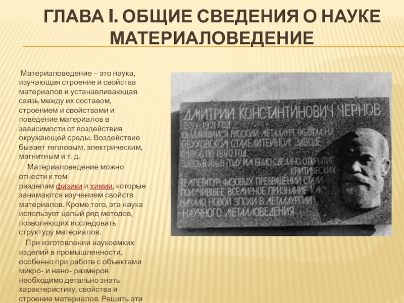 Слайд 3ГЛАВА I. ОБЩИЕ СВЕДЕНИЯ О НАУКЕ МАТЕРИАЛОВЕДЕНИЕ