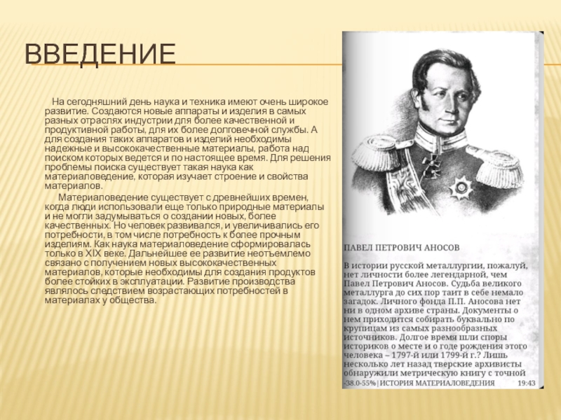 Из последующих работ по материаловедению особо следует отметить труды выдающегося русского металлурга горного инженера генерал-майора П. П. Аносова (1799 – 1839 гг.). Он в 1831 г. впервые использовал микроскоп для изучения структуры металлов при исследовании строения высококачественной стали – булата, проблему изготовления которой П. П. Аносов блестяще разрешил на Златоустовском заводе (1837 г.). Им была установлена связь между строением стали и ее свойствами. Аносов, по существу, явился зачинателем производства высококачественных сталей, играющих важнейшую роль в современной технике. В своих работах П. П. Аносов изучил также влияние углерода на структуру и свойства стали, оценил роль ряда других элементов.