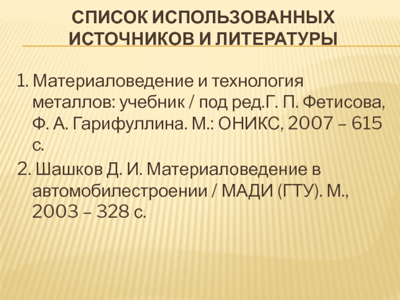 2. Шашков Д. И. Материаловедение в автомобилестроении / МАДИ (ГТУ). М., 2003 – 328 с.