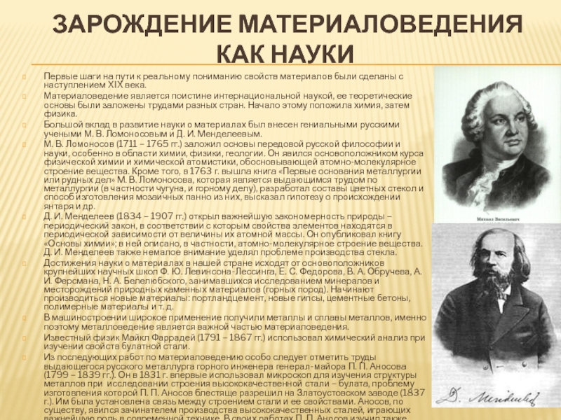 Большой вклад в развитие науки о материалах был внесен гениальными русскими учеными М. В. Ломоносовым и Д. И. Менделеевым.