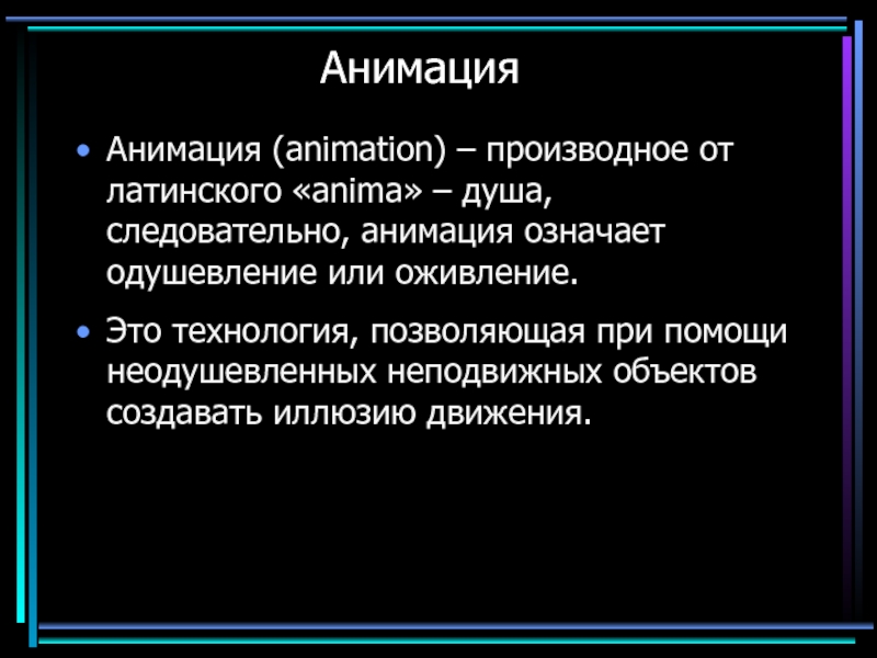 Анимация (animation) – производное от латинского «anima» – душа, следовательно, анимация