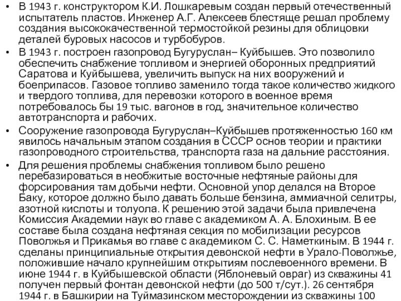 Были сооружены: магистральный нефтепровод Оха-Софийская, магистральный керосинпровод Астрахань-Урбах-Саратов. Значительная масса добытого нефтяного сырья шла теперь на крекирование, нашли применение пирогенная трубчатка, алкилирование бензола. Коксовые кубы, методы комбинированной очистки и вторичной перегонки нефти. Удельный вес бензина в объемах конечной продукции за годы войны поднялся с 20 до 30-35%. В результате применения риформинга низкооктановых лигроинов увеличился выход компонентов авиабензина и танковых топлив.