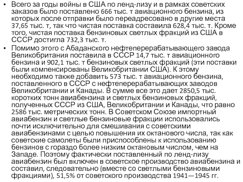 Помимо этого с Абаданского нефтеперерабатывающего завода Великобритания поставила в СССР 14,7 тыс. т авиационного бензина и 902,1 тыс. т бензиновых светлых фракций (эти поставки были компенсированы Великобритании США). К этому необходимо также добавить 573 тыс. т авиационного бензина, поставленного в СССР с нефтеперерабатывающих заводов Великобритании и Канады. В сумме все это дает 2850,5 тыс. коротких тонн авиабензина и светлых бензиновых фракций, полученных СССР из США, Великобритании и Канады, что равно 2586 тыс. метрических тонн. В Советском Союзе импортный авиабензин и светлые бензиновые фракции использовались почти исключительно для смешивания с советскими авиабензинами с целью повышения их октанового числа, так как советские самолеты были приспособлены к использованию бензинов с гораздо более низким октановым числом, чем на Западе. Поэтому фактически поставленный по ленд-лизу авиабензин был включен в советское производство авиабензина и составил, следовательно (вместе со светлыми бензиновыми фракциями), 51,5% от советского производства 1941—1945 гг.