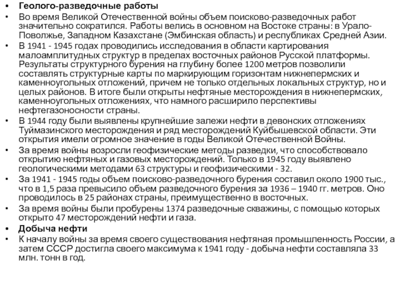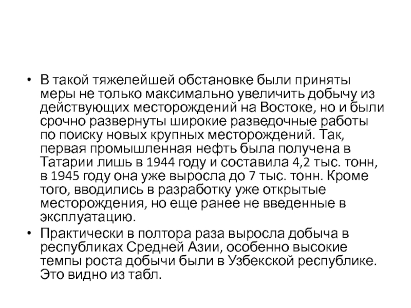 добычу из действующих месторождений на Востоке, но и были срочно развернуты широкие разведочные работы по поиску новых крупных месторождений. Так, первая промышленная нефть была получена в Татарии лишь в 1944 году и составила 4,2 тыс. тонн, в 1945 году она уже выросла до 7 тыс. тонн. Кроме того, вводились в разработку уже открытые месторождения, но еще ранее не введенные в эксплуатацию.