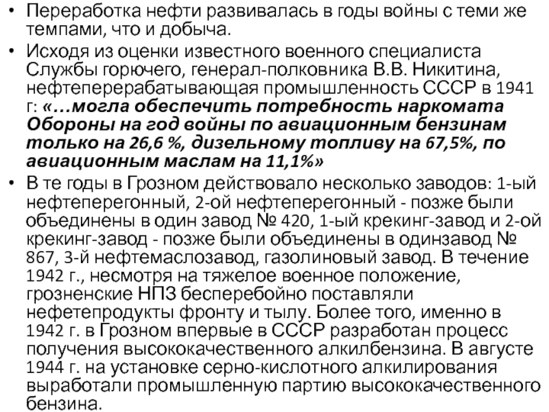 В те годы в Грозном действовало несколько заводов: 1-ый нефтеперегонный, 2-ой нефтеперегонный - позже были объединены в один завод № 420, 1-ый крекинг-завод и 2-ой крекинг-завод - позже были объединены в одинзавод № 867, 3-й нефтемаслозавод, газолиновый завод. В течение 1942 г., несмотря на тяжелое военное положение, грозненские НПЗ бесперебойно поставляли нефетепродукты фронту и тылу. Более того, именно в 1942 г. в Грозном впервые в СССР разработан процесс получения высококачественного алкилбензина. В августе 1944 г. на установке серно-кислотного алкилирования выработали промышленную партию высококачественного бензина.