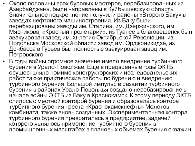 Куйбышевскую область. Значительное подкрепление получили районы «Второго Баку» в заводах нефтяного машиностроения. Из Баку были перебазированы эаводы им. Сталина, им. Дзержинского, им. Мясникова, «Красный пролетарий», из Туапсе в благовещенск был эвакуирован завод им. XI-летия Октябрьской Революции, из Подольска Московской области завод им. Орджоникидзе, из Донбасса в Гурьев был полностью эвакуирован завод им. Петровского.