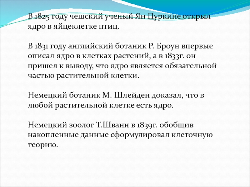 В 1831 году английский ботаник Р. Броун впервые описал ядро в клетках растений, а в 1833г. он пришел к выводу, что ядро является обязательной частью растительной клетки.