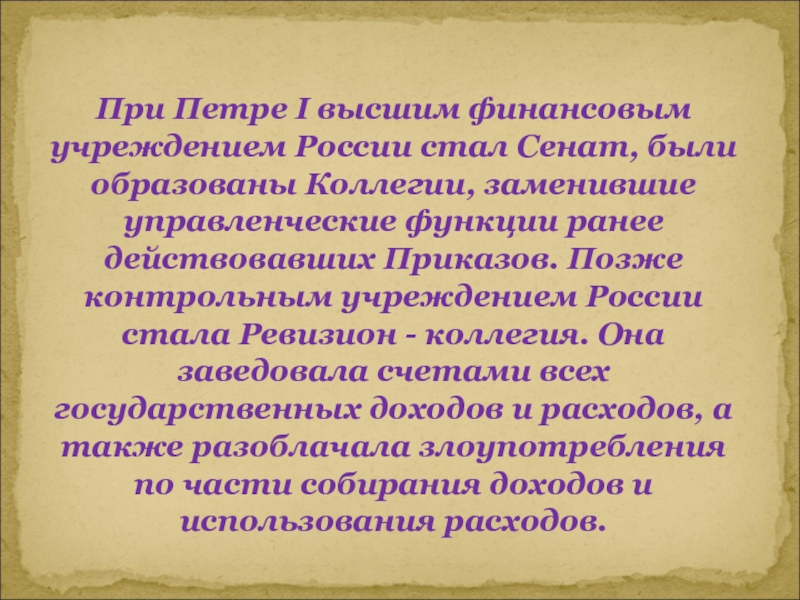 Слайд 4При Петре I высшим финансовым учреждением России стал Сенат, были образованы