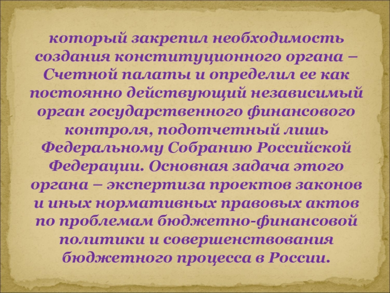 Слайд 23который закрепил необходимость создания конституционного органа – Счетной палаты и определил