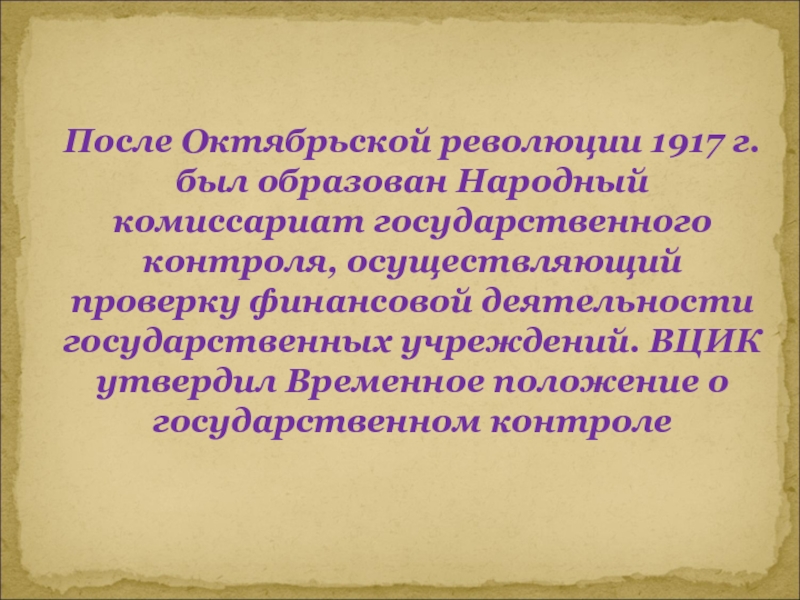 Слайд 14После Октябрьской революции 1917 г. был образован Народный комиссариат государственного контроля,