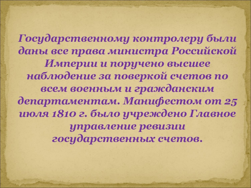 Слайд 9Государственному контролеру были даны все права министра Российской Империи и поручено