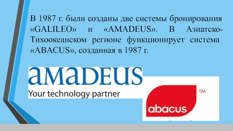 Слайд 12В 1987 г. были созданы две системы бронирования «GALILEO» и «AMADEUS».