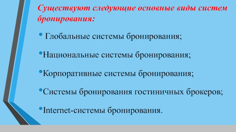 Слайд 14Существуют следующие основные виды систем бронирования: