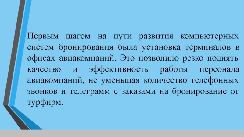 Слайд 6Первым шагом на пути развития компьютерных систем бронирования была установка терминалов
