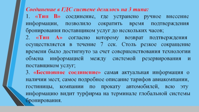 - ГДС (Global Distribution Systems). Параллельно с расширением функций компьютерных систем бронирования активно велись работы, направленные на сокращение срока получения турагентом подтверждение бронирования от поставщика услуг.