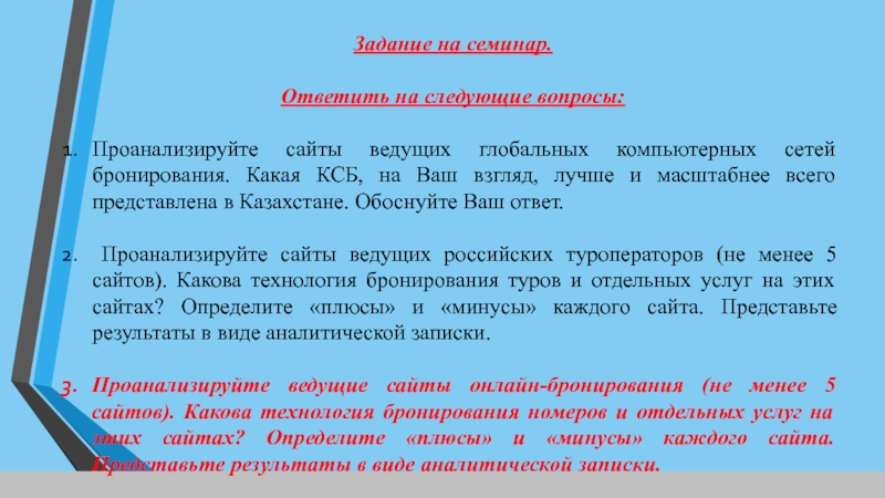 Проанализируйте ведущие сайты онлайн-бронирования (не менее 5 сайтов). Какова технология бронирования номеров и отдельных услуг на этих сайтах? Определите «плюсы» и «минусы» каждого сайта. Представьте результаты в виде аналитической записки.