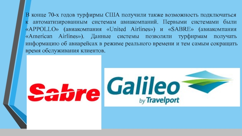 автоматизированным системам авиакомпаний. Первыми системами были «APPOLLO» (авиакомпания «United Airlines») и «SABRE» (авиакомпания «American Airlines»). Данные системы позволяли турфирмам получать информацию об авиарейсах в режиме реального времени и тем самым сокращать время обслуживания клиентов.