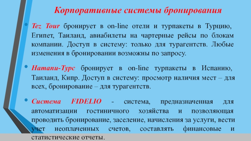3. «Бесшовное соединение» самая актуальная информация о наличии мест, самое подробное описание тарифов авиакомпании, гостиницы, компании по прокату автомобилей, всю эту информацию видит турфирма на терминале глобальной системы бронирования.