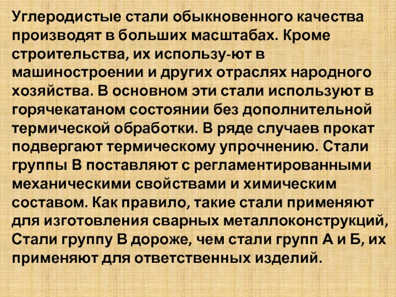 Слайд 12Углеродистые стали обыкновенного качества производят в больших масштабах. Кроме строительства, их
