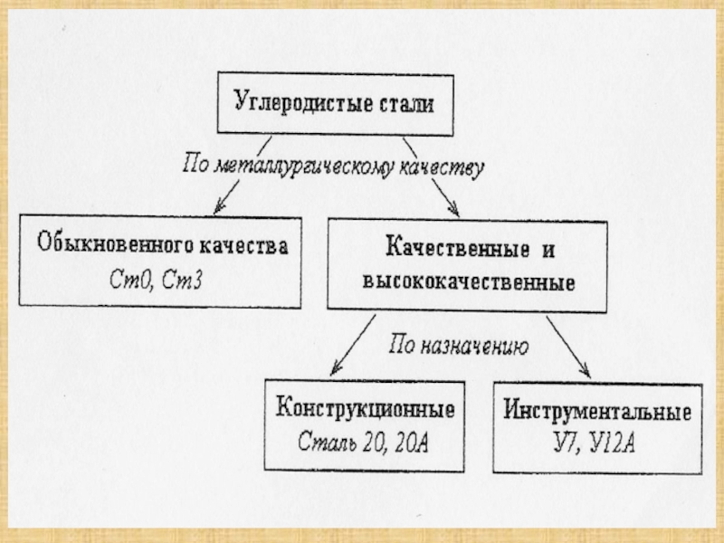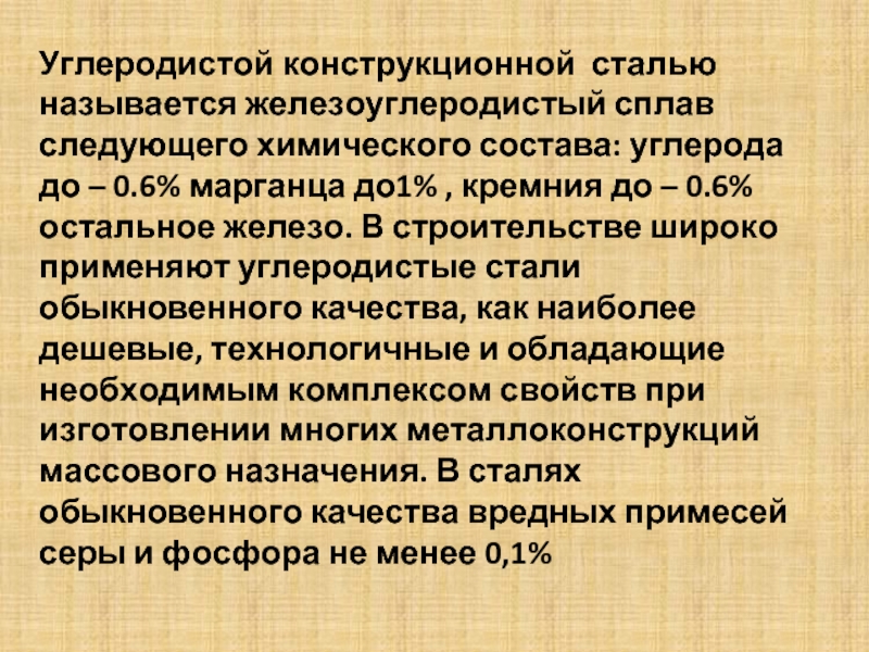 Слайд 11Углеродистой конструкционной сталью называется железоуглеродистый сплав следующего химического состава: углерода до