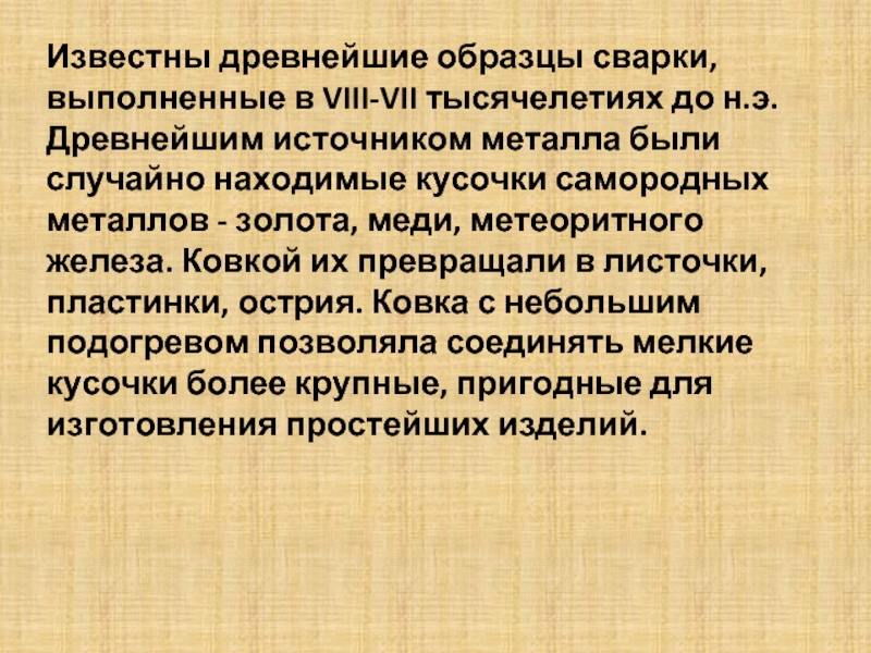 Слайд 2Известны древнейшие образцы сварки, выполненные в VIII-VII тысячелетиях до н.э. Древнейшим
