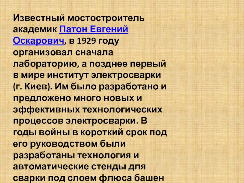 Слайд 7Известный мостостроитель академик Патон Евгений Оскарович, в 1929 году организовал сначала лабораторию,