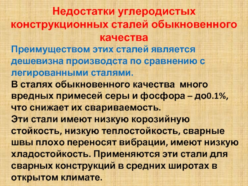 Слайд 16Недостатки углеродистых конструкционных сталей обыкновенного качества