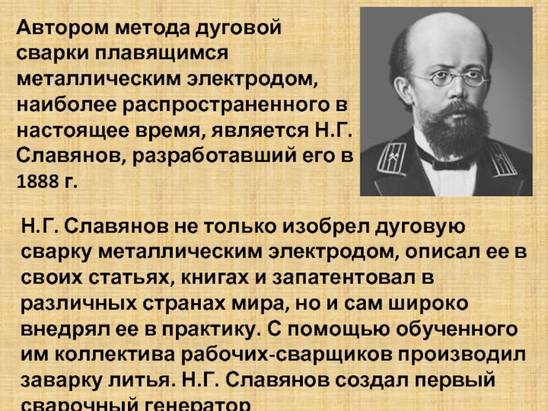 Н.Г. Славянов не только изобрел дуговую сварку металлическим электродом, описал ее в своих статьях, книгах и запатентовал в различных странах мира, но и сам широко внедрял ее в практику. С помощью обученного им коллектива рабочих-сварщиков производил заварку литья. Н.Г. Славянов создал первый сварочный генератор
