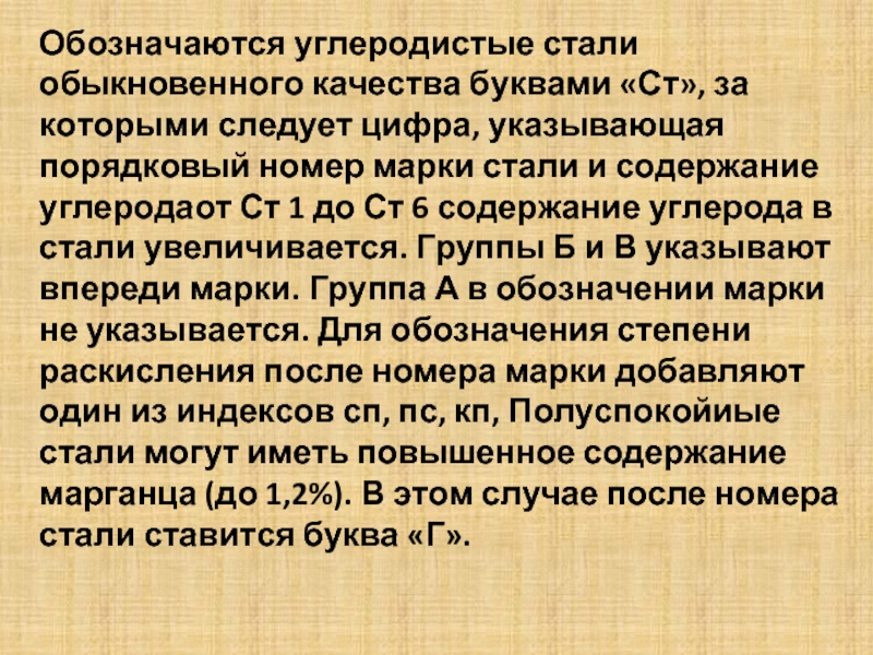 Слайд 13Обозначаются углеродистые стали обыкновенного качества буквами «Ст», за которыми следует цифра,