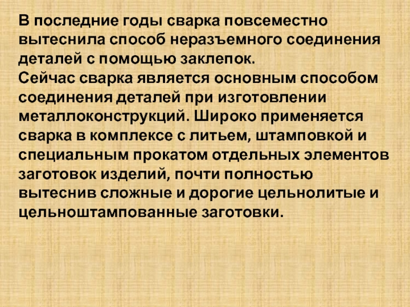 Слайд 8В последние годы сварка повсеместно вытеснила способ неразъемного соединения деталей с