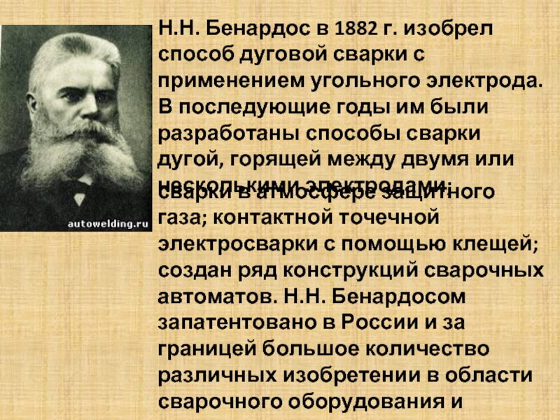 сварки в атмосфере защитного газа; контактной точечной электросварки с помощью клещей; создан ряд конструкций сварочных автоматов. Н.Н. Бенардосом запатентовано в России и за границей большое количество различных изобретении в области сварочного оборудования и процессов сварки.