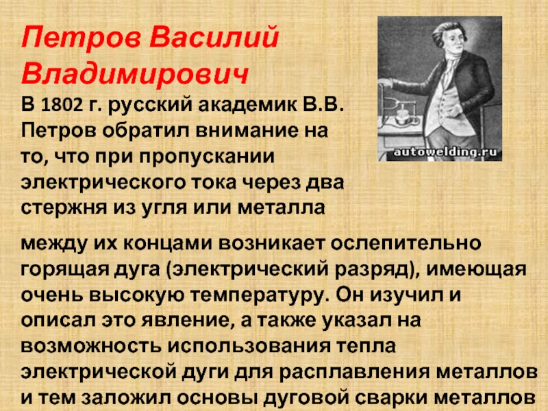 между их концами возникает ослепительно горящая дуга (электрический разряд), имеющая очень высокую температуру. Он изучил и описал это явление, а также указал на возможность использования тепла электрической дуги для расплавления металлов и тем заложил основы дуговой сварки металлов