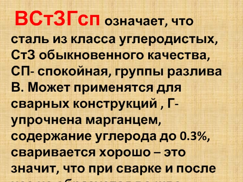 Слайд 14 ВСтЗГсп означает, что сталь из класса углеродистых, СтЗ обыкновенного качества,