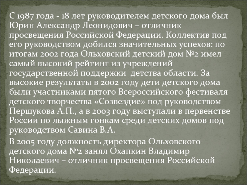 Слайд 9С 1987 года - 18 лет руководителем детского дома был Юрин