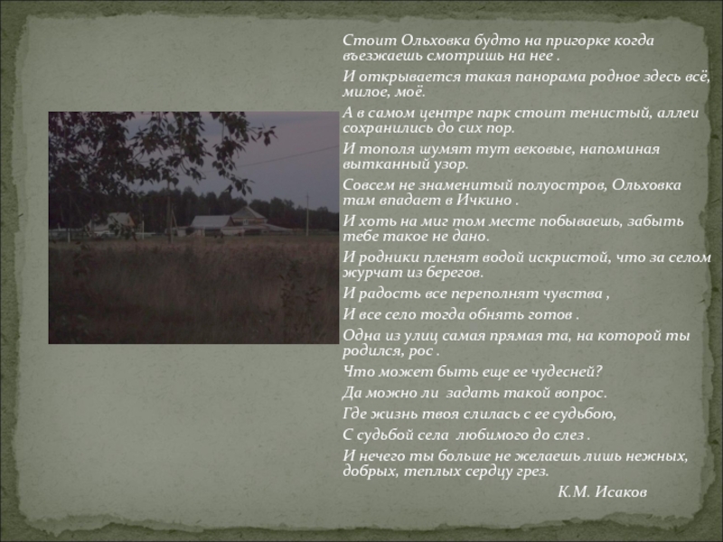 Слайд 3Стоит Ольховка будто на пригорке когда въезжаешь смотришь на нее .