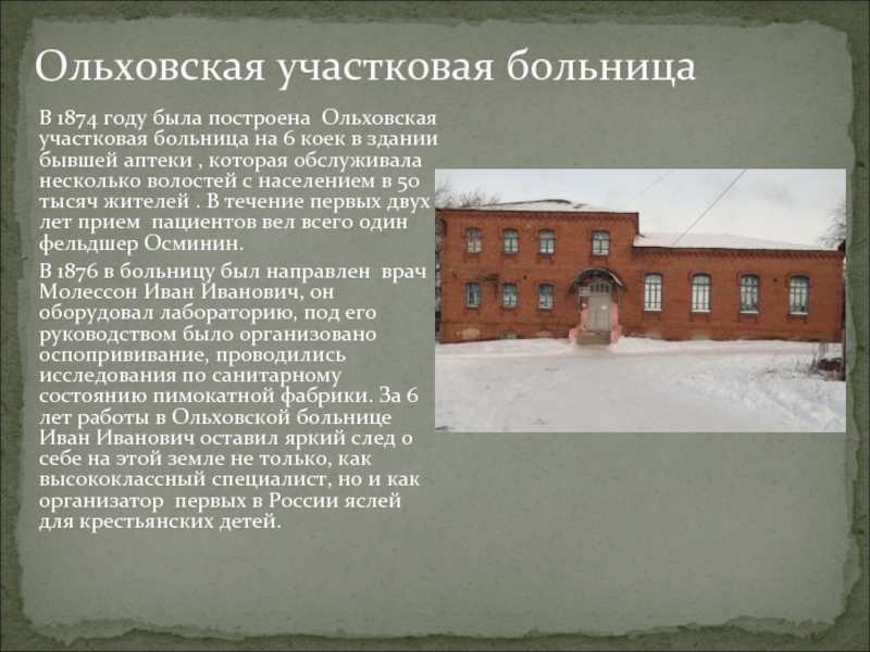 В 1876 в больницу был направлен врач Молессон Иван Иванович, он оборудовал лабораторию, под его руководством было организовано оспопрививание, проводились исследования по санитарному состоянию пимокатной фабрики. За 6 лет работы в Ольховской больнице Иван Иванович оставил яркий след о себе на этой земле не только, как высококлассный специалист, но и как организатор первых в России яслей для крестьянских детей.